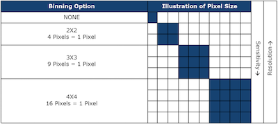Binning combines several pixels to make a larger, virtual CCD to increase sensitivity. By creating a large pixel out of a 2×2 pixel box, sensitivity is four times greater, and the resolution or number of pixels is four times less.